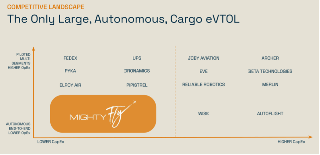 Competitively, I consider MightyFly to sit in the sweet spot of technology and business economics. It is the only fully autonomous large cargo VTOL (i.e. cargo greater than 100 lbs.) with low capex requirements and long-range, multi-stop capabilities.